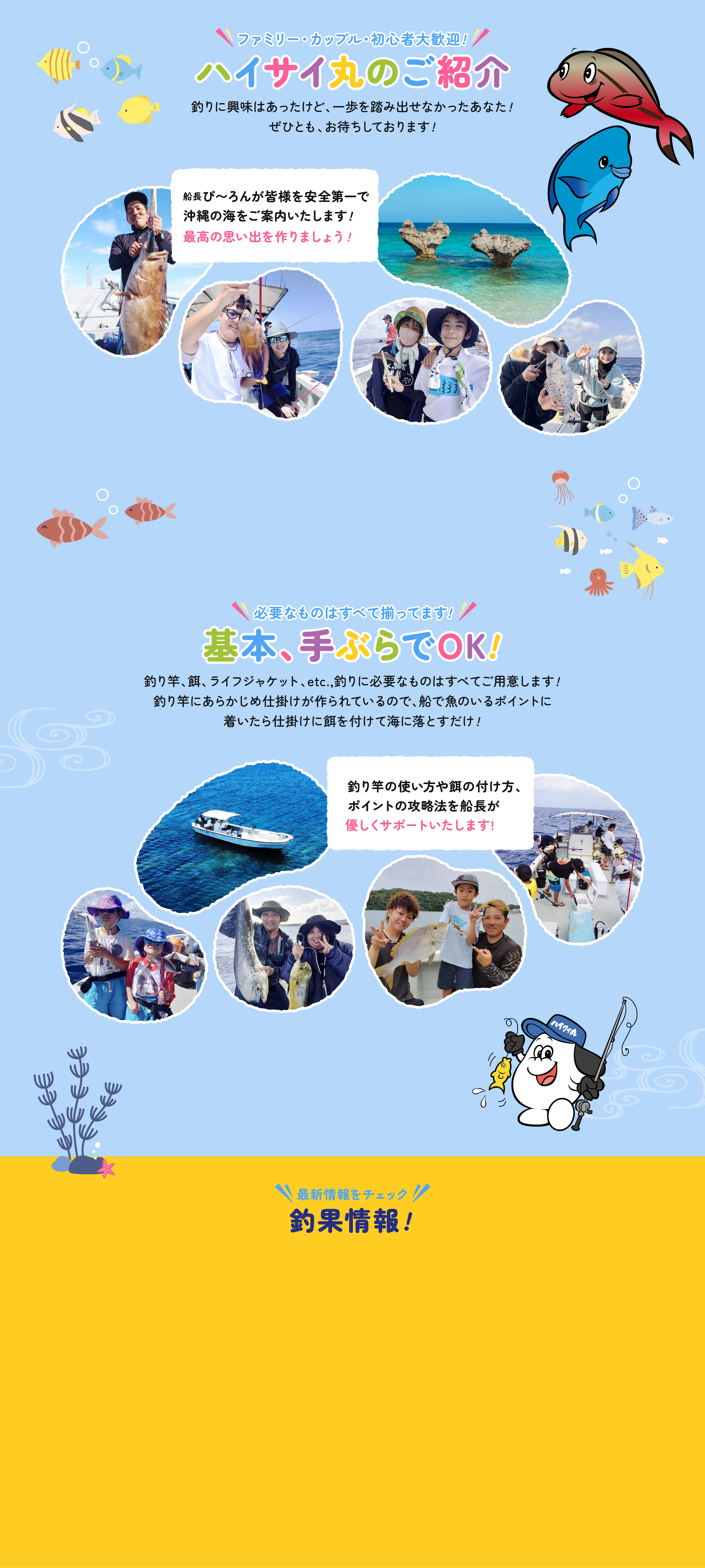 ホームページにはサビキ釣り専門のような記述があったと思いますが、平日の乗船で我々夫婦のみだったので、船長さんの好意により胴付きやダツ釣りを体験させてもらいました。その他には、古宇利大橋の真下や澄んだ沖縄の海を実感できる水深8mの砂地(海底のヒトデがはっきり見える)など、沖縄の海を観光できます。