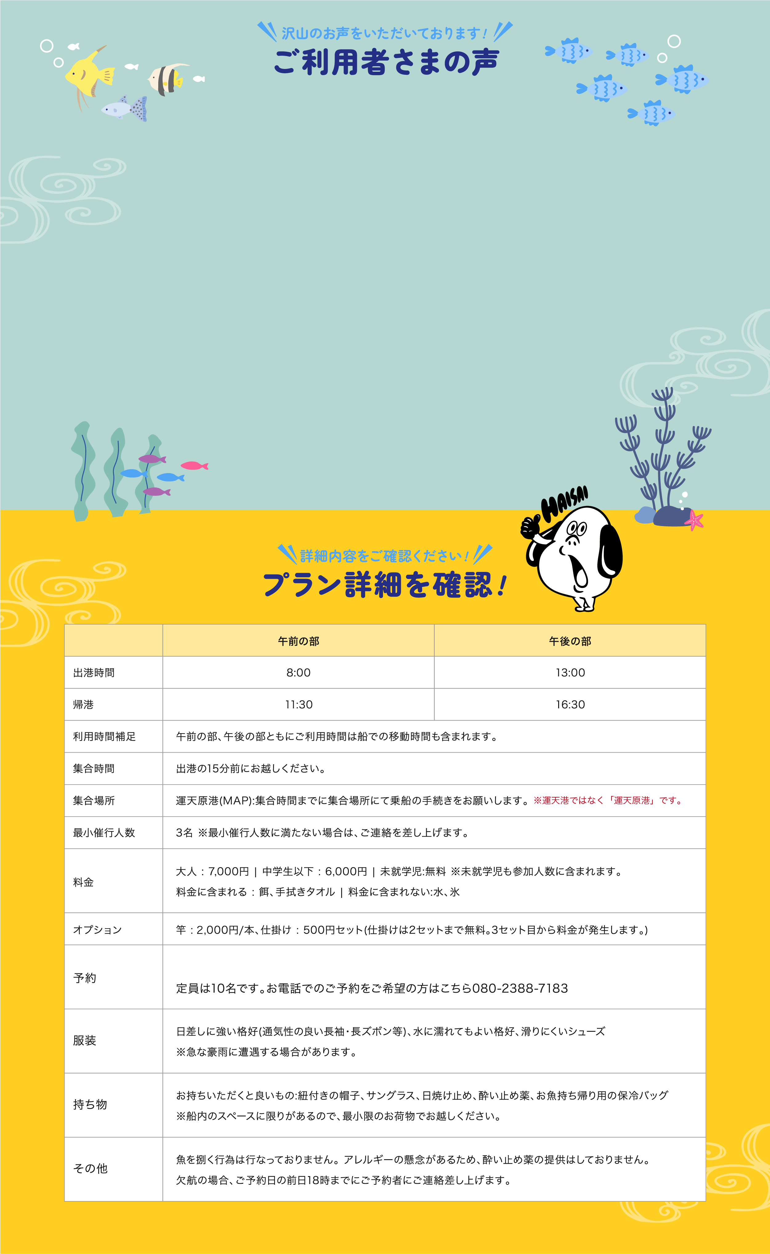 釣りに詳しくない方でもキレイな海で安心して釣りが出来たり、自分達で釣った魚を食べれるので小さなお子さんがいるファミリーには素晴らしい体験になると思います!!