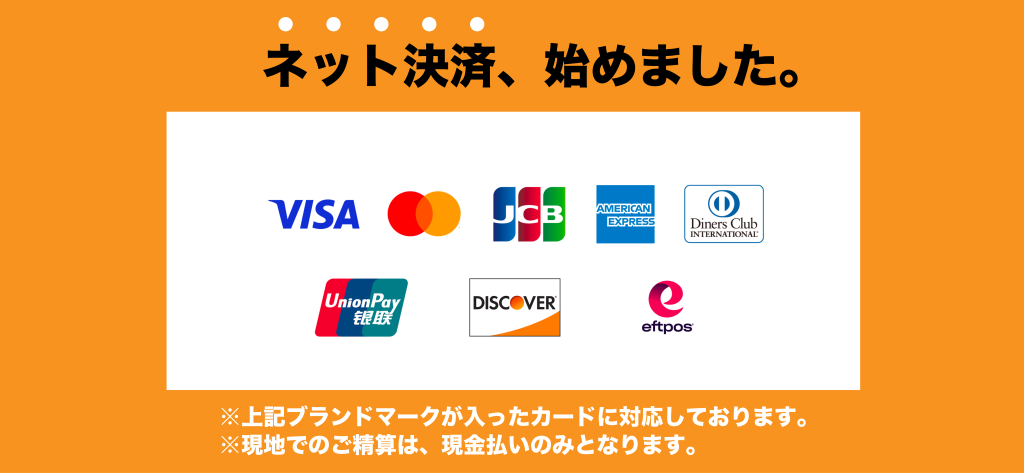 ネット決済が可能となりました。 2023年5月12日 未分類 ホームページからのご予約のみ、ネット決済が可能となりました。 ※現地でのご精算は、現金精算のみとなります。 アメリカン・エキスプレス 中国銀聯 (CUP) ディスカバーおよびダイナース eftpos オーストラリア JCB Mastercard Visa URL Copied!